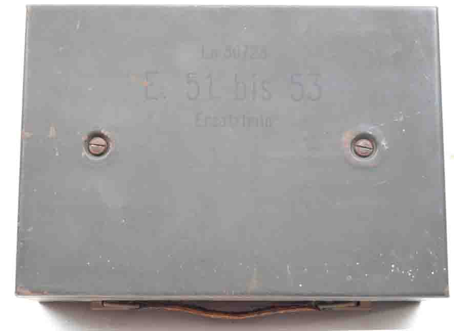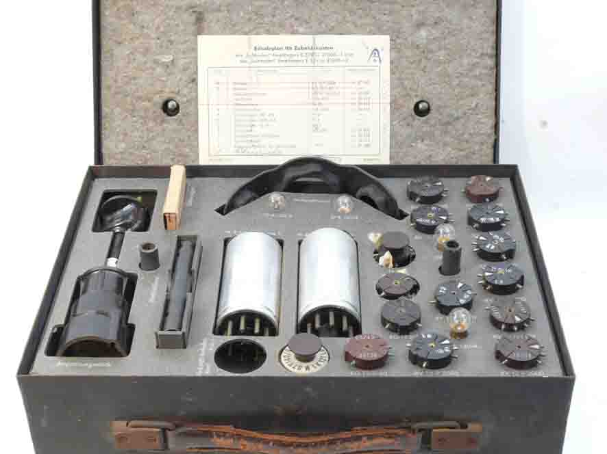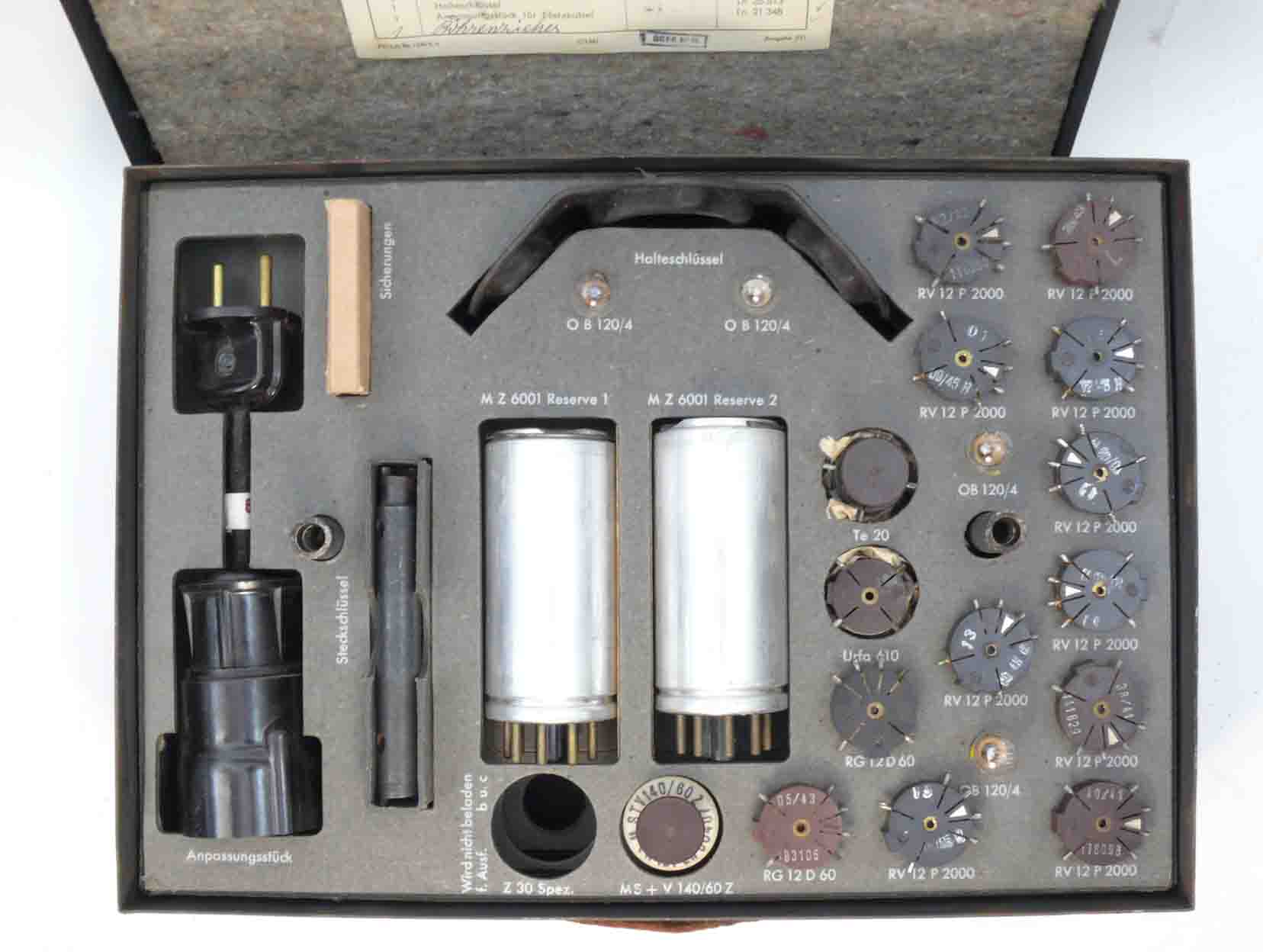 The early receivers might all have had metal spare-part boxes, whereas later in the war cardboard boxes were used, sometimes fit with far less parts. This is understandable, why should you need, for instance, a full set of spare RV12P2000 valves*, as these are very reliable components, with a rather long life cycle? * notice that the Köln employed 10 and the Ulm even 12 'P2000s'; note, that only one valve type throughout the entire receiver is used! (neglecting, of course, the power supply)