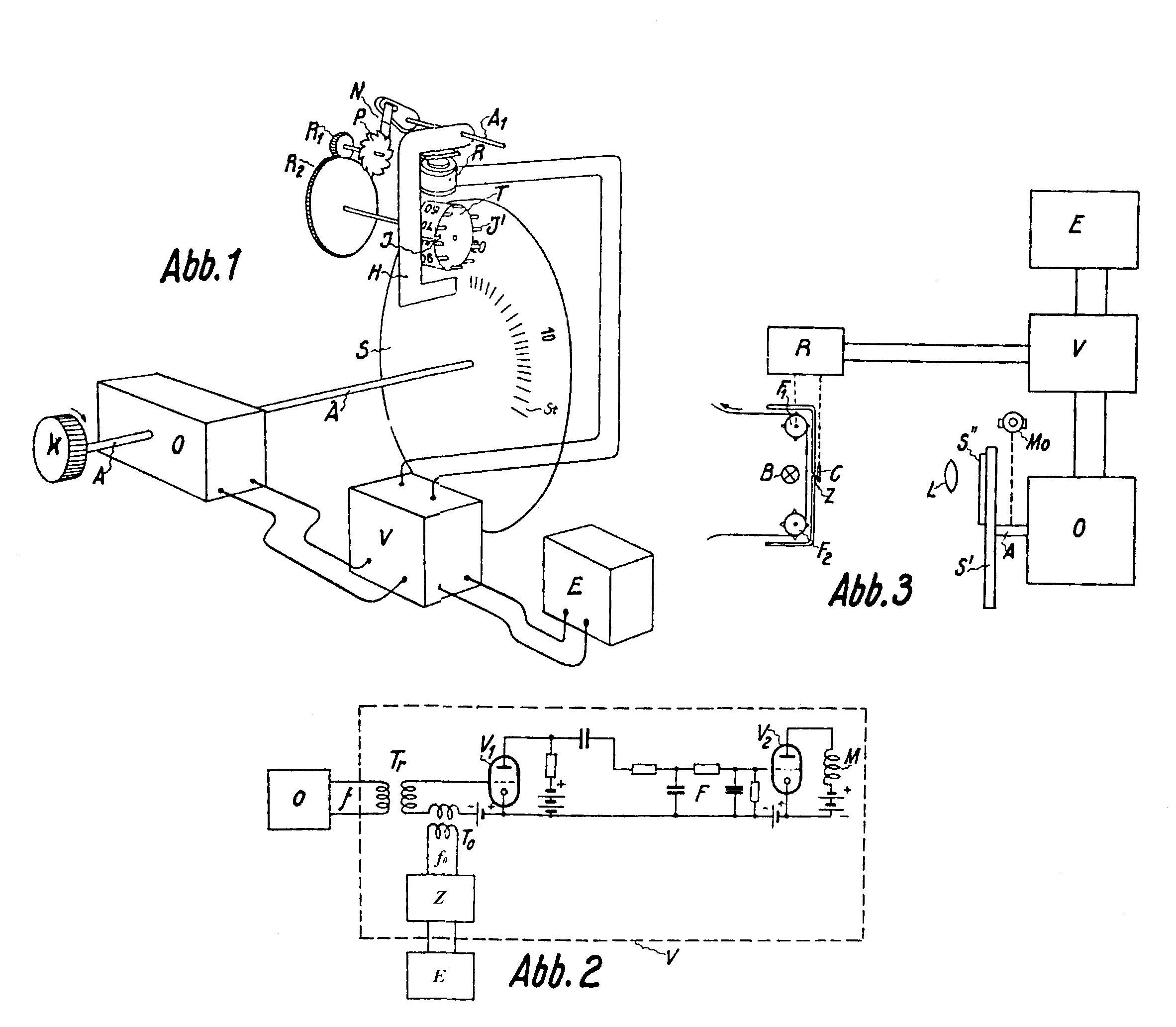 Wird die Achse A durch einen Motor M0 langsam über ihren Drehbereich hinweggedreht, so entstehen bei jeder Resonanz der Oszillatorschwingung mit der Schwingung des Eichoszillators E am Ausgang der etwa nach Abb. 2 ausgebildeten Vergleichseinrichtung V elektrische Impulse, welche das Relais R auslösen und kurzzeitig den Verschluß C öffnen.