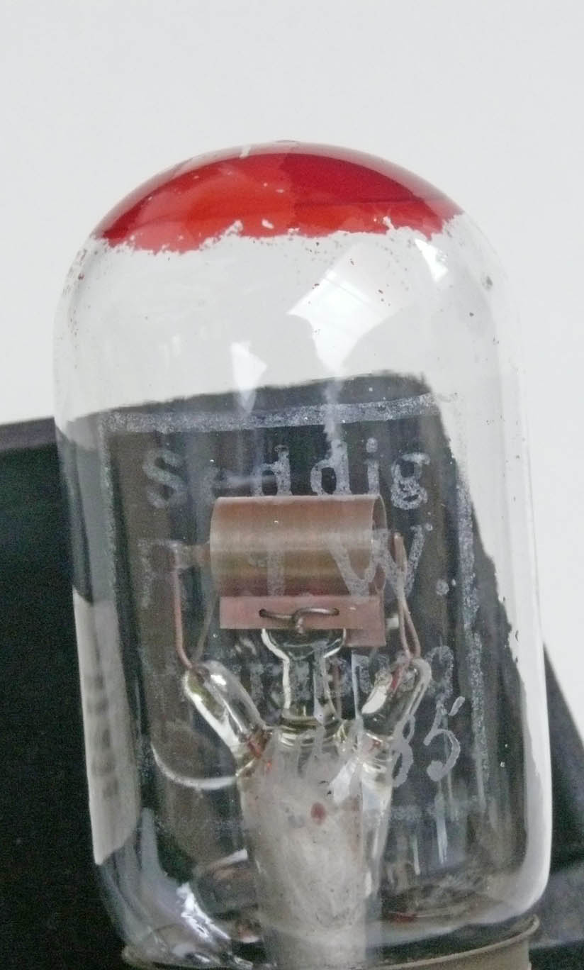 Typical is the way the filament is 'hanging' above the spiral grid, which itself is mounted just above the anode plate; both kept separated by means of glass drips