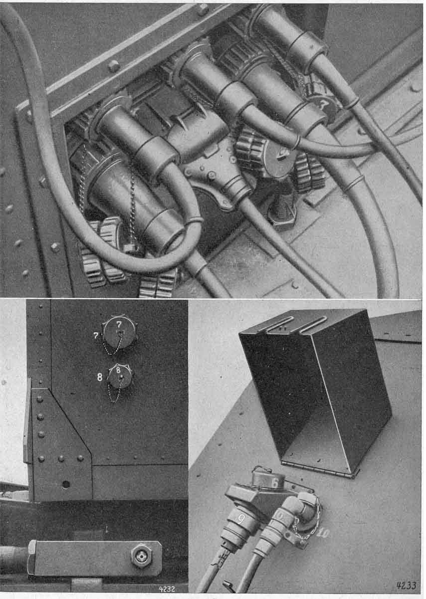 Detailed pictures of the various interconnections onto (and from) this Giant Wurzburg radar installation. Connectors 9 and 10 are most likely for the FuSE65 radar and for the IFF antennae signals. Viewing their size, I guess, that number 9 is for the radar signal (receive and transmit) and number 10 is meant for the IFF operation (although, according the table on document page 32, not equal to the pdf page numbering, might causing doubts, I am still confident that cable connection number 9 is the one used for the radar signals). The upper photo is concerning the power cables, I guess, that the flat central connector is being meant for 3 phase power line (3x380V, max 17A, power requirement 12-15 kVA) and the rest is concerning operational data, like used for the transmission and/or operational parameters. Most likely firstly linked onto Ü-37 (Servos which are being phase-error-controlled repeaters). Please regard also ekm-Rechner. These round heavy connectors were known as 'Renk-Stecker' and where having a wide range of pin configurations, as to prevent for incorrect interconnections . The upper shown connectors were mounted at the fixed-base-frame-chassis (please notice the second photo), so that the Giant Wurzburg could rotate on its pivot freely, thus not being hampered by cable restrictions what so ever. (Schleifring-Übertragung). Please notice the cover-nut shown down/right, which is carrying character '6' whereas the connector is carrying number 9; the cover-nut is meant to be mounted upside-down, when no cable is connected!