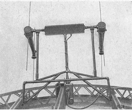 A rare detailed photo of the IFF antenna array (Kennung: Kuh-Gemse). Viewing it from the rear side of the antenna-dish (mirror). The two dipoles nearest to us are both acting as reflectors. Please notice the fine structure of the reflector mesh!