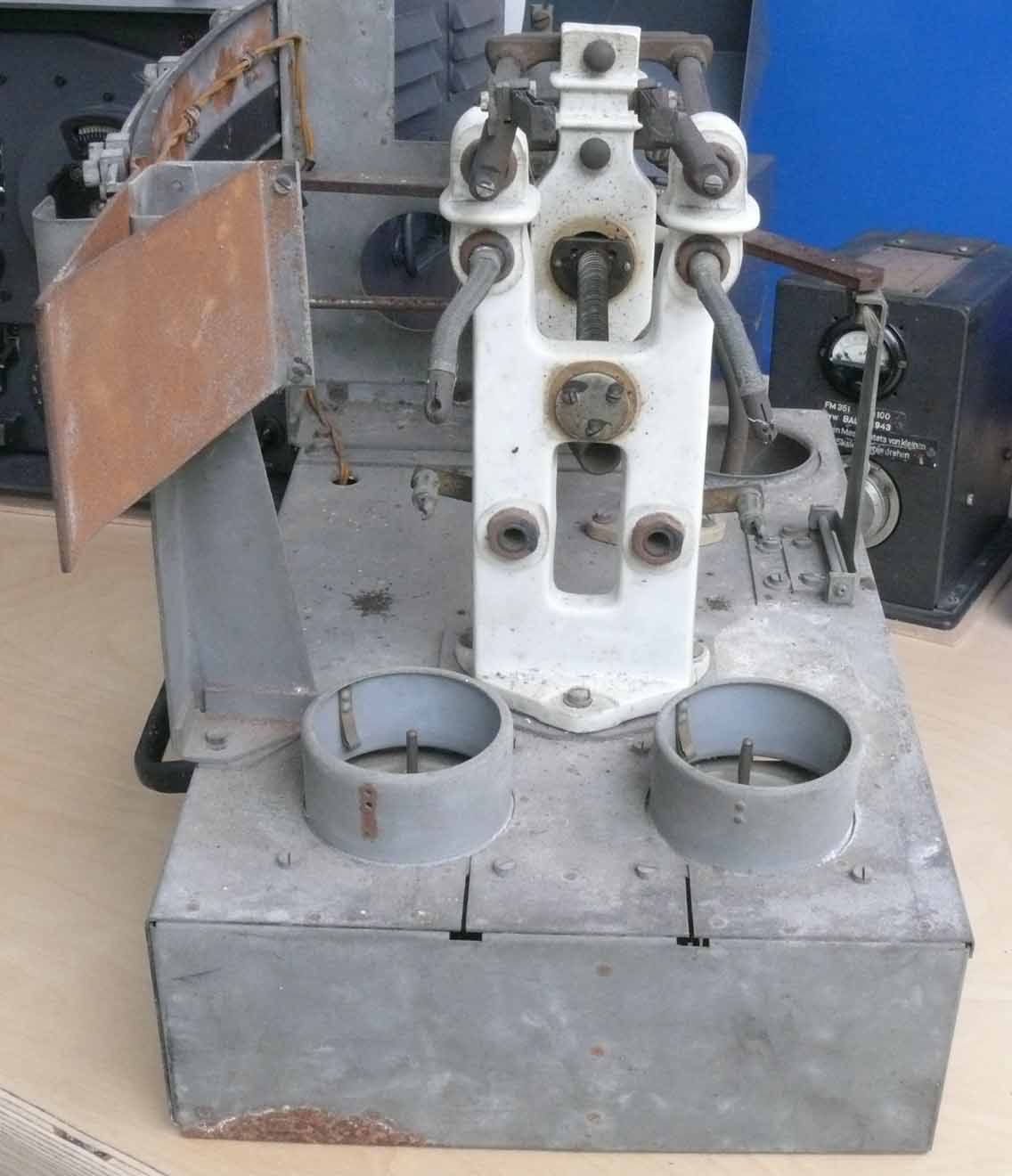 The two knife like connector is for the filament supply (handling 22 A). The one in the centre is eventually for grid blocking or keying. The contact on the right is for anode voltage 10 or 25 kV.