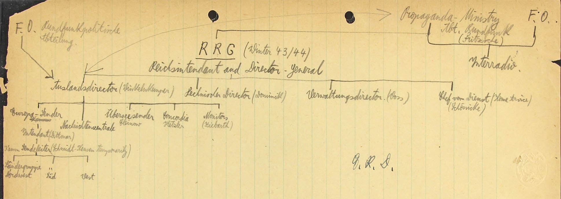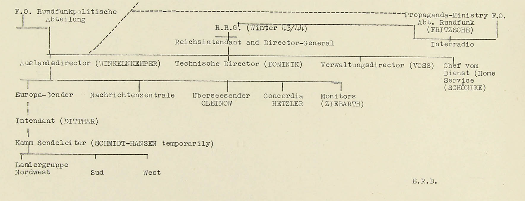 According to an S.I.S. (Secret Intelligence Service, M.I.6) report November 1939, Dietze was in charge of the broadcasting to England (AOB: formally incorrect, but at the nearest to the microphone he, indeed, was) and this is the position which he seems to have held throughout the war. German official documents found on the Radio Station confirm this. He was in fact at one time in charge of the English, Irish, Danish and Dutch Reserve sections and so important was his position that when the Junior staff was evacuated from Berlin to Luxemburg in the summer of 1943m Dietze remained in Berlin, having been transferred from the post of Director of National Groups (Ländergruppenleiter) (AOB: think of section head and no "Direktor"!) to the Foreign Direktorship (he was, actually, not!) so that contact with political direction (Propaganda) might be maintained. He was responsible for the day to day transmission of directives (AOB: this is not what a "Direktor" should accomplish). A number of gramophone records were found at Luxemburg with his name upon them and apparently recording his voice giving these directives. (It seems to have been the practice for instruction and messages to be spoken in Berlin and recorded in Luxemburg either by direct transmission or over the air).