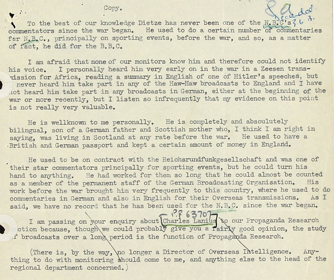 A Miss I.D. Benzie who worked at the B.B.C. said in 1941 that she knew Dietze well. Before the war he had been a news and sports Outside Broadcast commentator for the Reichsrundfunk Gesellschaft and used to come over to Britain several times a year for ceremonial occasions and national sporting events. Miss Benzie said that she knew his voice well and had since the war heard him speak on the radio several times in English in place of William Joyce (= Lord Haw-Haw). She said that in addition to a British passport he also had a German passport. This fact is confirmed →