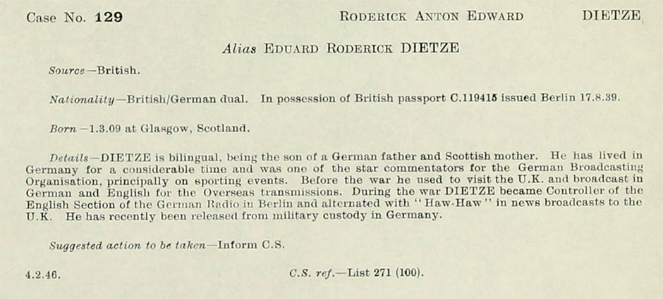 Details - Dietze is bilingual, being the son of a German father and a Scottish mother. He has lived in Germany for a considerable time and was one of the star commentators for the German Broadcasting Organisation particularly on spotting events. Before the war he used to visit the U.K. and broadcast in German and English for the Overseas transmissions. During the war Dietze became Controller of the English Section of the German Radio in Berlin and alternated with "Haw-Haw" (William Joyce) in news broadcasts to the U.K. He has recently been released from military custody in Germany.