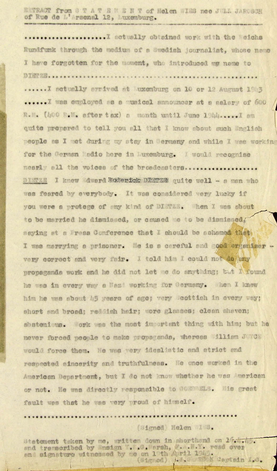 by an American newspaper man called Warren E. Irvin who had while in Germany has recommended Dietze as an interpreter. He said that Dietze had been gaoled by the Gestapo at the outbreak of war as a potential British spy, then cleared himself and was allowed to continue his work as a free-lance broadcaster handling English programmes.