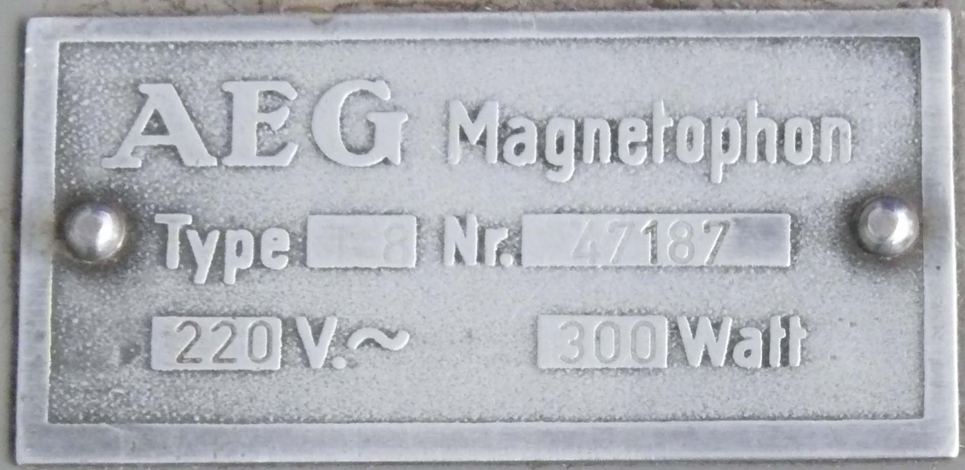 das Typenschild der Maschine 47187 scheint mir eher die Bezeichnung "T 8" statt "K 8" zu tragen. Das deutet darauf hin, dass diese Maschine bei AEG Hamburg gebaut wurde, nicht in Berlin. Vor allem die recht breite Frontplatte spricht für "T 8" - beim K 8 standen die 30 cm-Bandteller rechts und links über die Frontplatte hinaus.