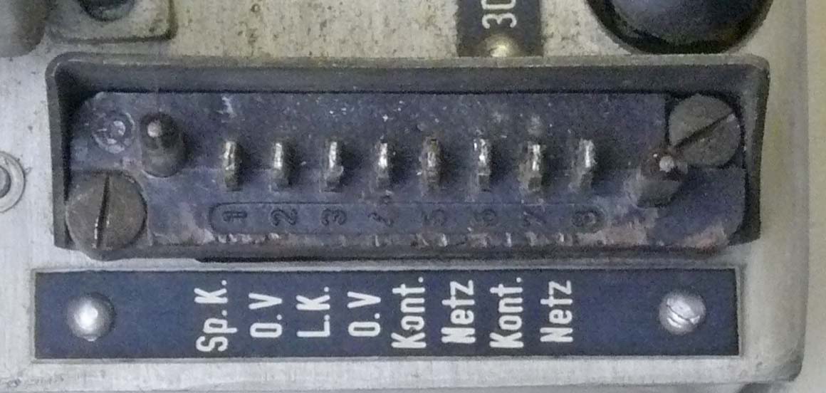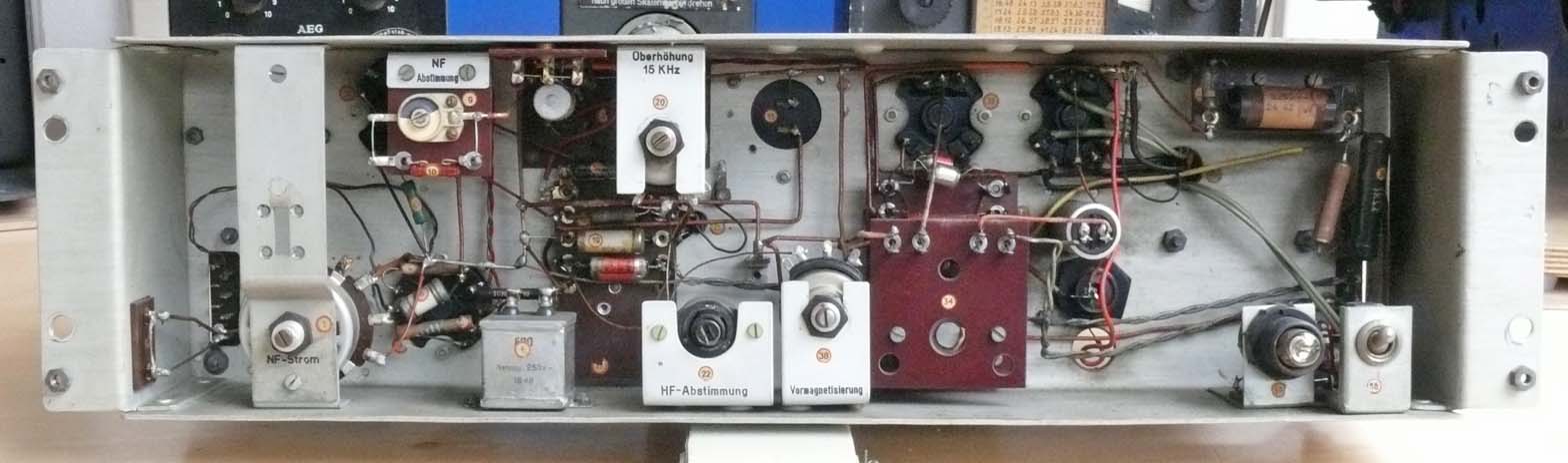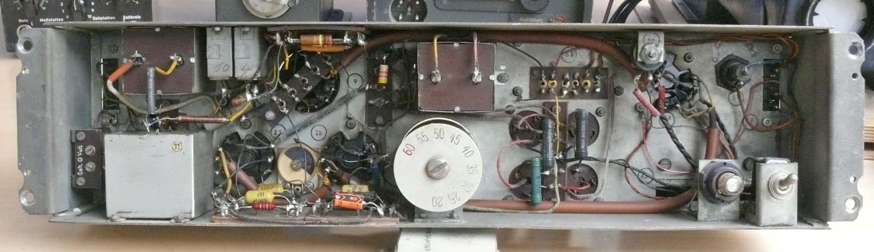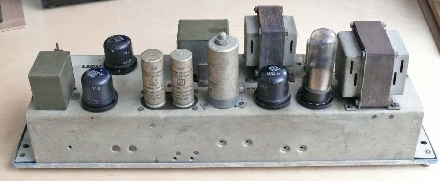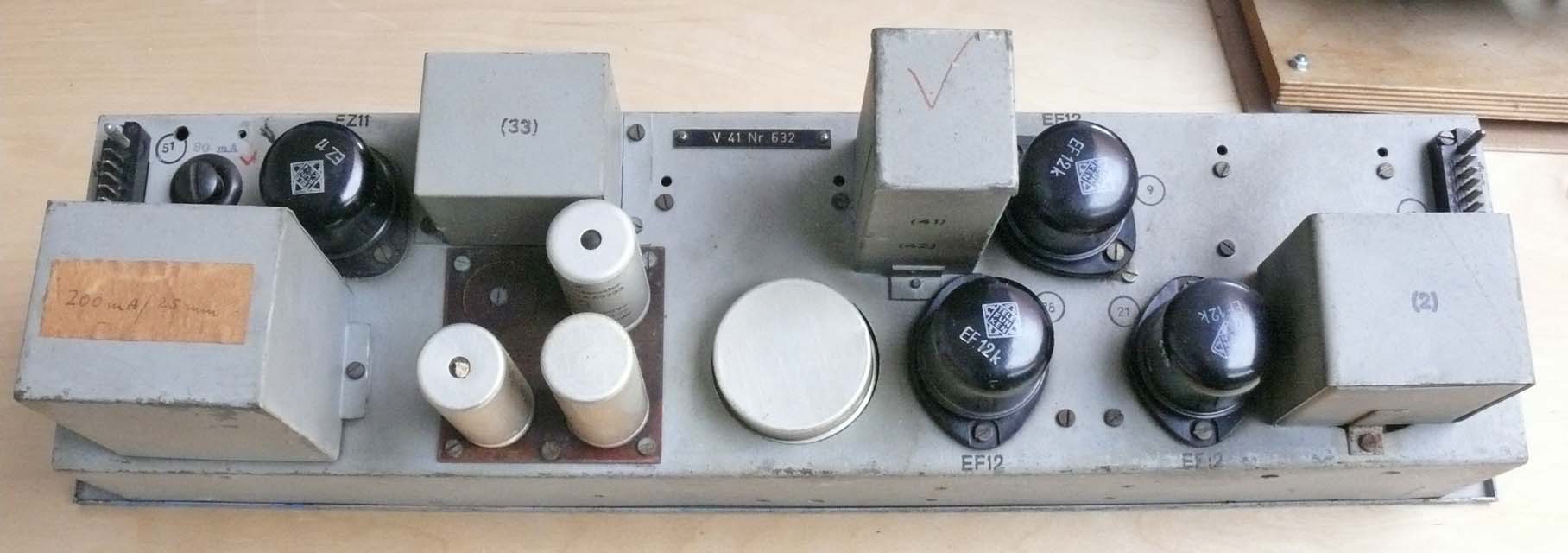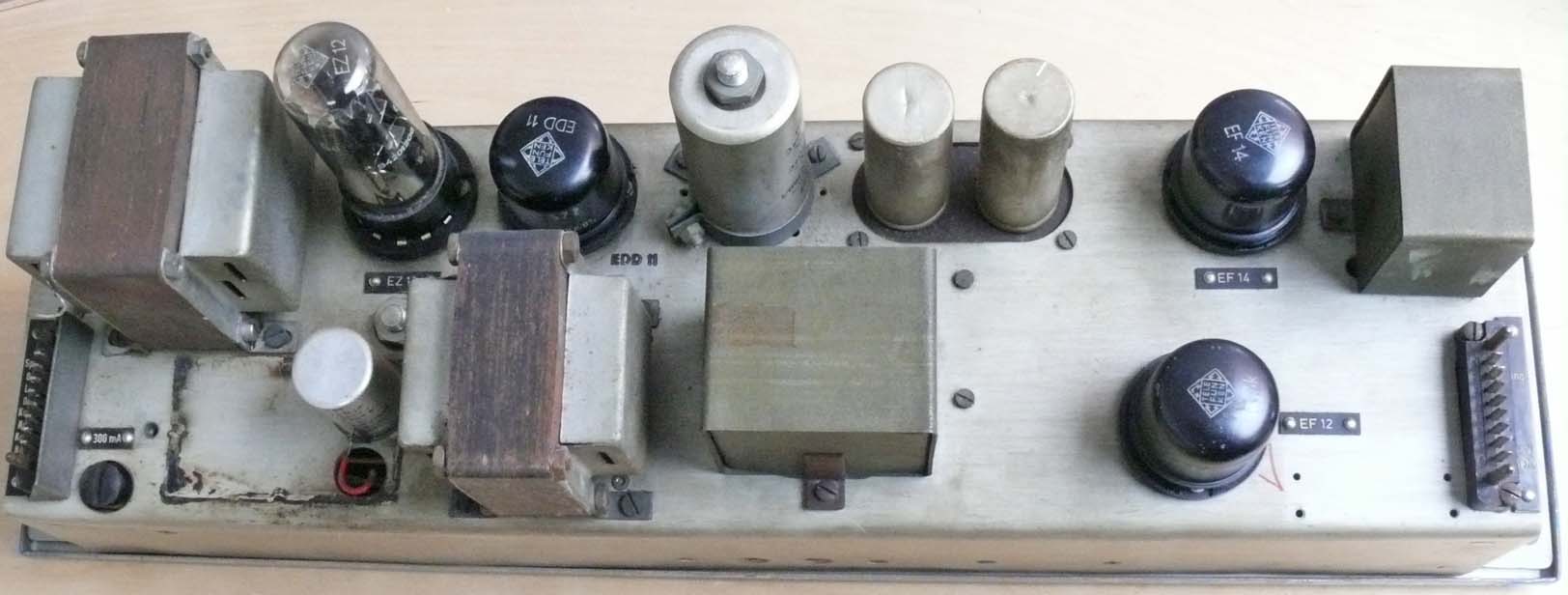 Viewing module V47/2 from the top. The involved valves are: EF14 - EF12 - EDD11 and a rectifier EZ 12 (a quite power full type) The plugs on both sides are of the so-called Tuchel type; very reliable types and widely adapted!