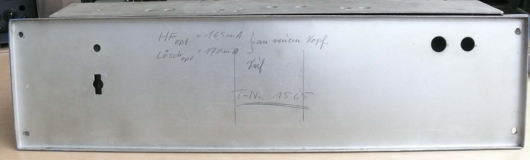Taking off its front panel we notice: HFopt = 16.5 mA; Löschopt (optimal HF-Erasing head current) = 170 mA. Both to be adjusted for new heads. T-Nr. 1565 is the serial number of this module in the organisation