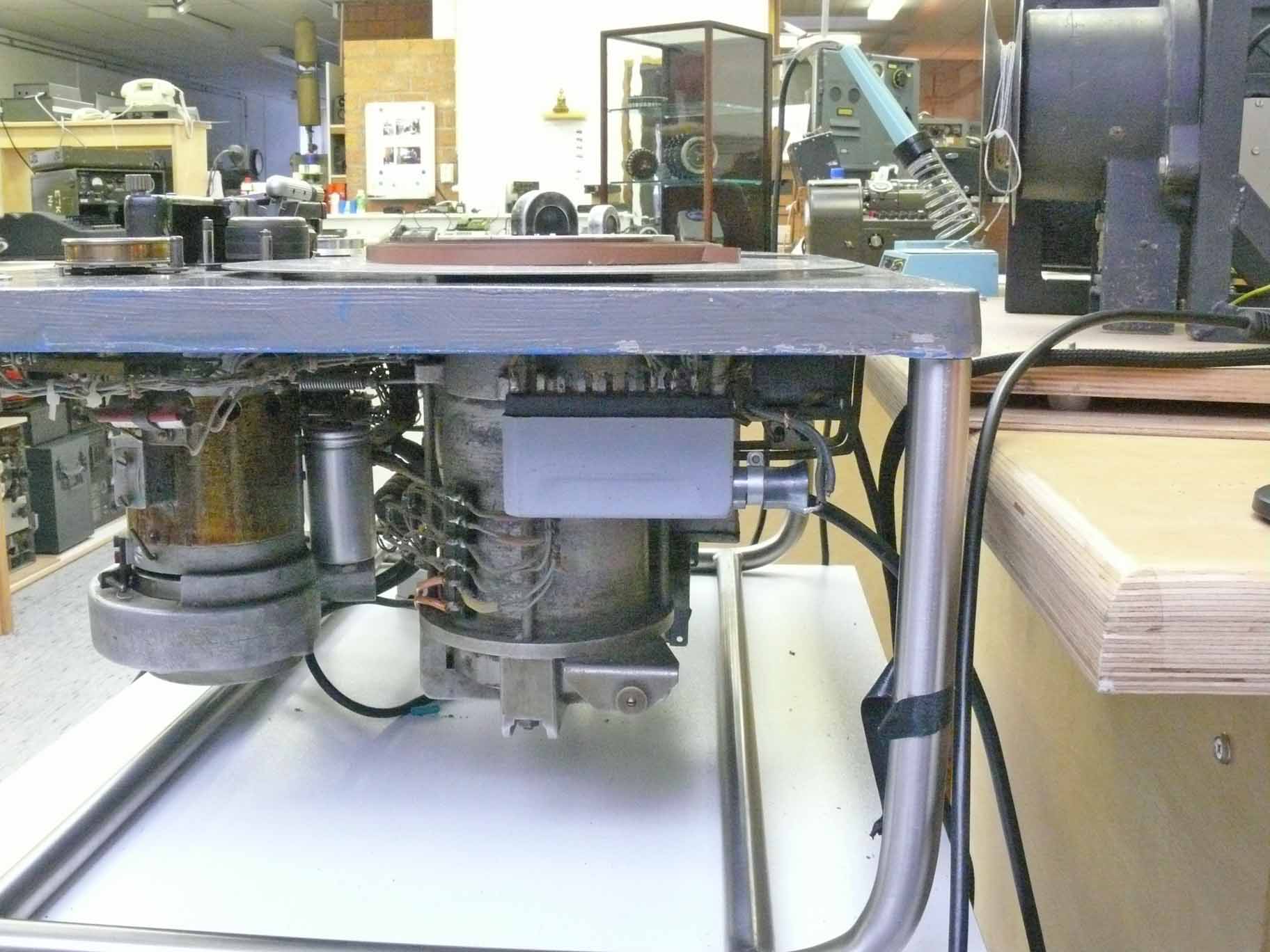 Unter der Laufwerksplatte waren links und rechts 3 cm Winkeleisen als Rechteckrahmen mit den Maßen der Laufwerksbreite und bei meinem Gerät mit der Höhe 21 cm, damit alle Bauteile frei hingen, wenn das Gerät auf einer Platte stand.