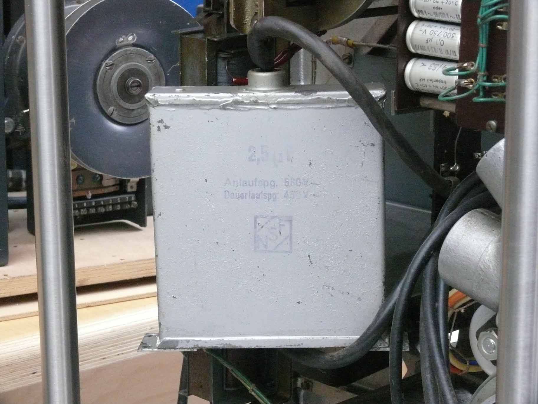 The idea of investigating the motor capacitors engendered after an e-mail exchange where someone suggested: look for the electrolytes. I first wondered, but then I realised having recently seen a Siemens paper of 1939 where they also deal with bipolar electrolytes for motors (Anlaufkondensatoren). The ones we employ are from, say, 1947, a bit old for an ac driven bipolar electrolytic capacitor isn't it?