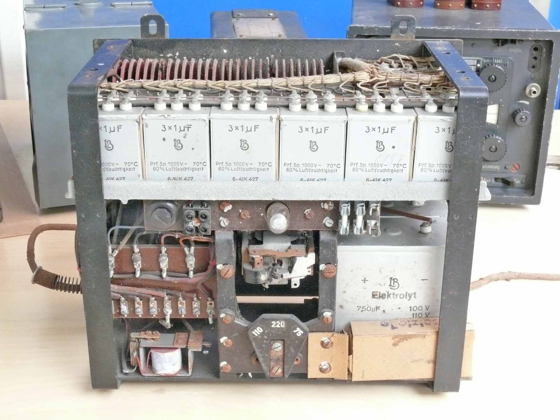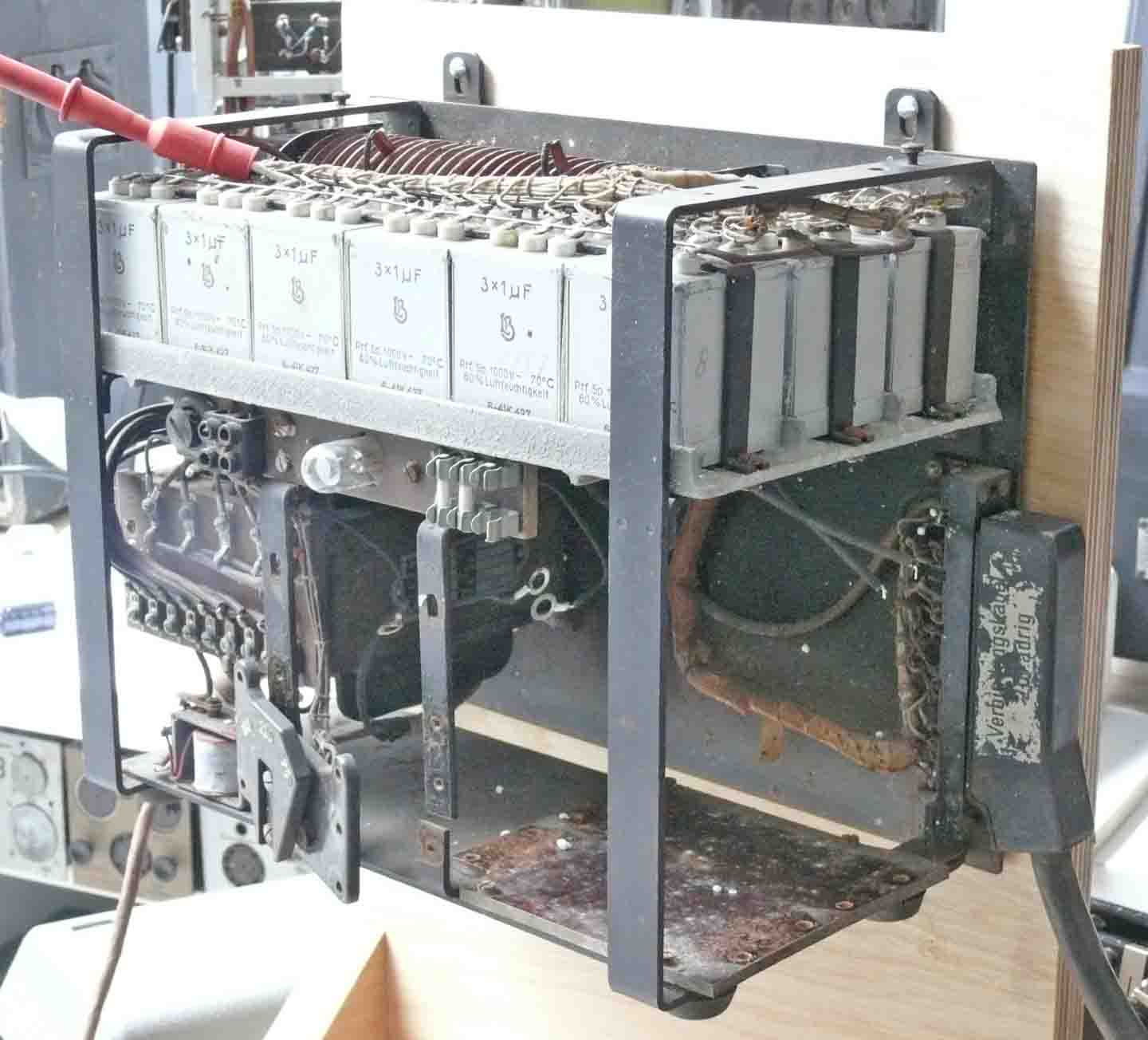 The MZSS power supply unit with the two electrolytic capacitors (2 x 750 µF in series, constituting 375 µF at 2 x 100 V = 200 V dc) on the right hand side already being removed. In the centre we see the empty space where the automatic-fuse-switch was mounted. Please notice in the previous photos the shape of the two electrolytic capacitor blocks. Measuring their capacity it is found that both had lost most of their capacitance. To keep the power unit as original as possible, we will leave them in place, though, have to bridge them by means of 4 modern tubular electrolytic capacitors. It has become our policy to leave block capacitors as they are, thus not opening them. Some collectors will put new capacitors inside the opened can. In my perception this is wrong doing, as in a matter of time these replaced electrolytic capacitors will also suffer from altering deviations. What is appropriate is, to bridge the block capacitors by modern state of the art ones. These are in most cases smaller and the available free space is sufficient to keep them without problems. The only problem encountered might be that paper capacitors of the 1940s and nowadays types might not differ much in their actual size. Especially for the high voltage types such as for types passing 500/750 V. When the time comes that it is no longer appropriate to switch on electrically an artefact, the bridged components can simply be removed and the genuine state of affairs is being restored. Only the difference in brightness of a soldering is then indicating that it once had been touched!