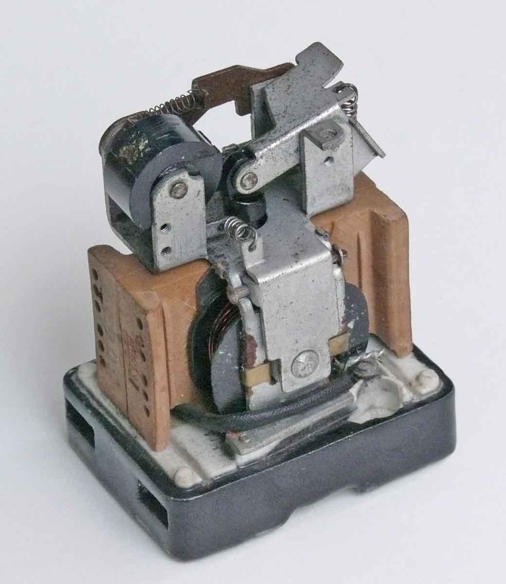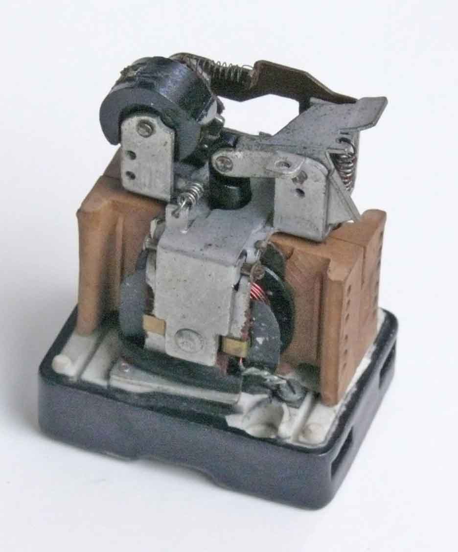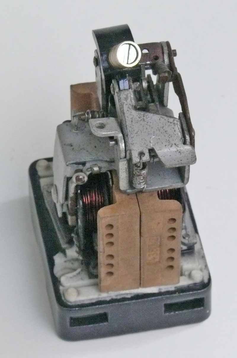 The same switch shown from a different perspective. The centre bobbin (one of out of two) is also part of the current sensitive relay arrangement