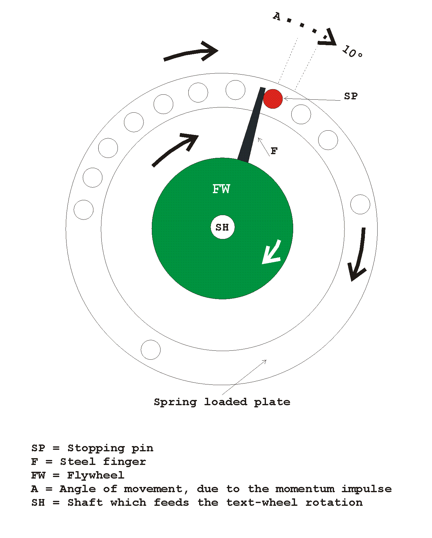 How does it work? When an electromagnet is being activated by means of the Enigma machine, one out of 26 is being ejected. As long as this doesn't occur the central shaft is rotating constantly. On the main shaft is mounted a long flat steel finger-strip. When a certain character is being activated inside the Enigma apparatus, the according pin is being ejected (activated). The quite fast rotating central finger arrangement is rotating until it is being hold (stopped) by means of the ejected brass pin. This will cause a mechanical impulse. What I haven't yet discussed is, that the spring loaded metal plate is mounted such, that it can also rotate about 10 degrees clockwise. In fact, it is relieving the mechanical momentum of the stopping mechanism, by absorbing the energy (stopping force) two things happen: first the hammer mechanism is being activated so that it struck for a short interval the paper tape onto the inked text wheel. Please try to recognise this wheel, where some characters are just visible. The second function is, of course, also a relevant one - as it is activating paper tape movement for a few mm, just after a character had been printed. The blue coloured felt ring is for supplying fresh ink onto the printer wheel (Schreibrad).