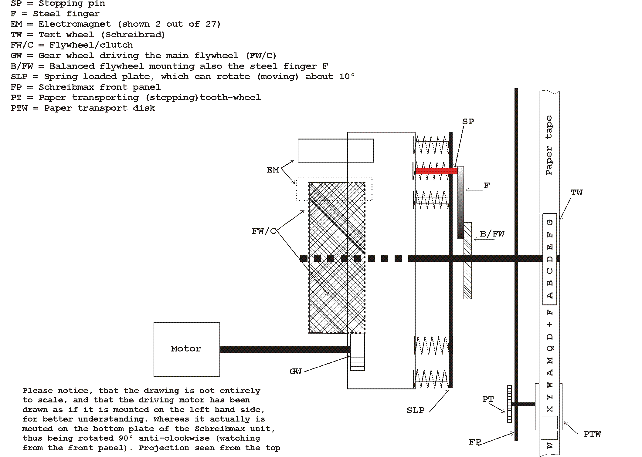 On 1 December I have tested whether my assumption is justified that the above pointed device FW/C is truly a flywheel-clutch. I marked both the outside cylinder and the (inside spring loaded) dark brown pertinax back-plate (please notice the photo with the driving motor). After I forced the Schreibmax machine to print one or two characters the flywheel markers had moved against one another. This friction clutch is thus absorbing the system-inertia.