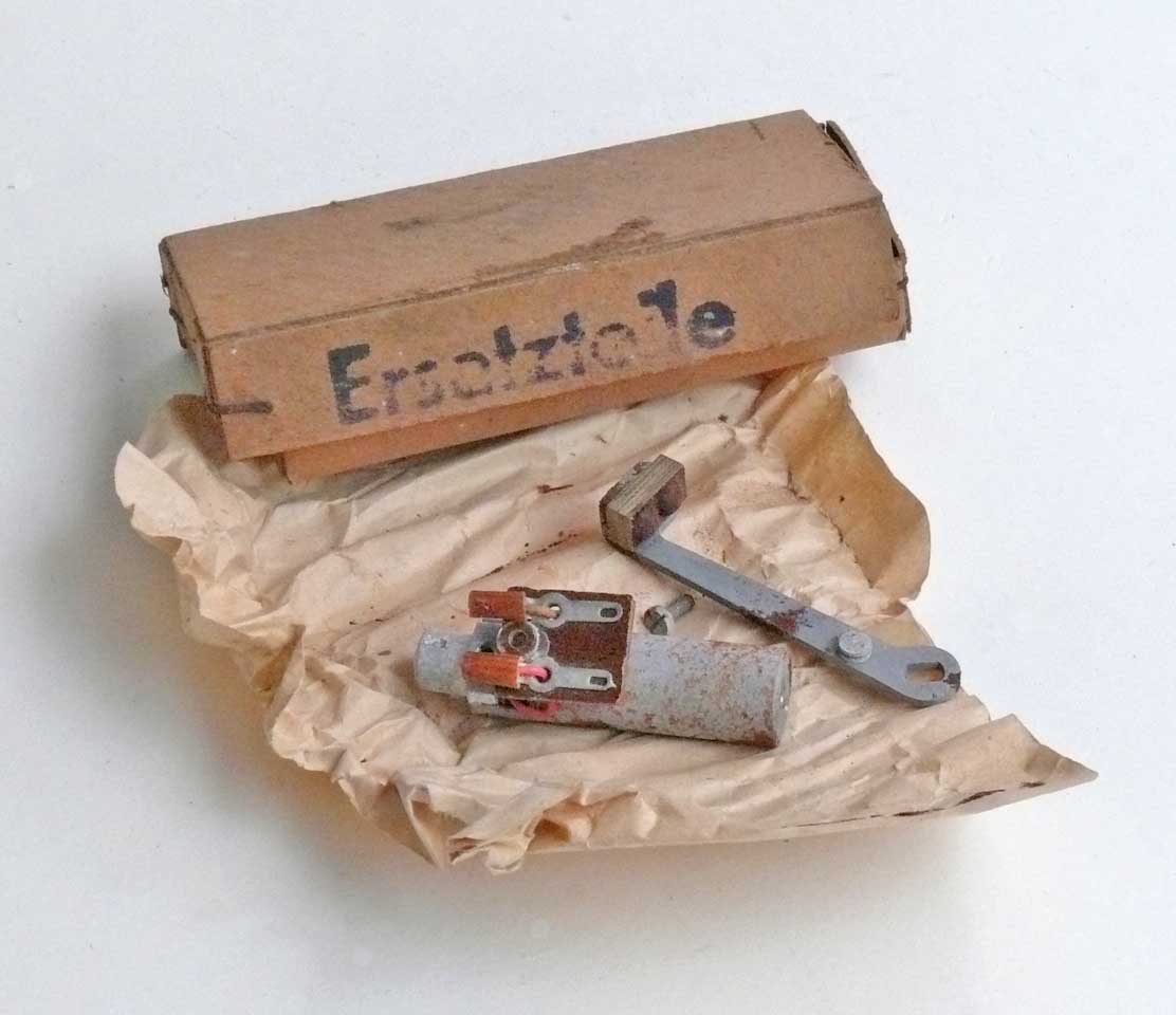 Why does it contain components that doesn't fit into the power supply? It is clear that these belong to the Schreibmax printer. Please consider the previous photo and you might see acquaintance between the lowest shown spare part and the circularly arranged tube like devices. Towards us is visible the character N which points to one side of a magnetic device (maybe not quite visible on this photo).