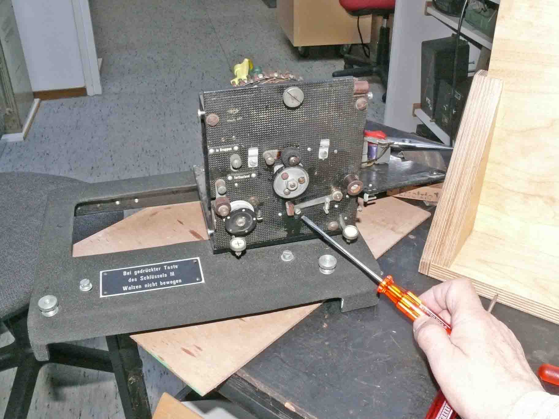 The Schreibmax being mounted on top of the Enigma M4 machine, as was done operationally