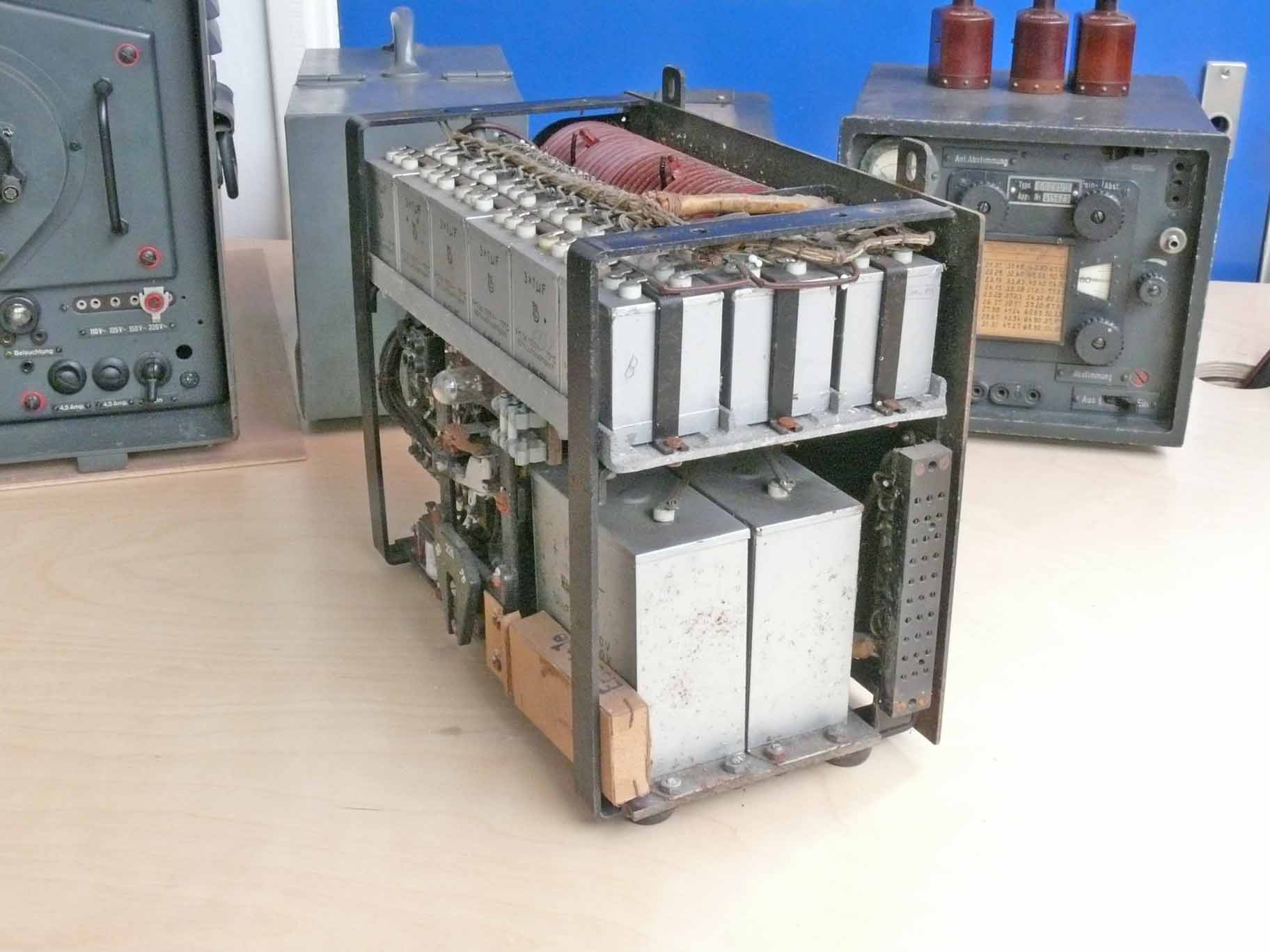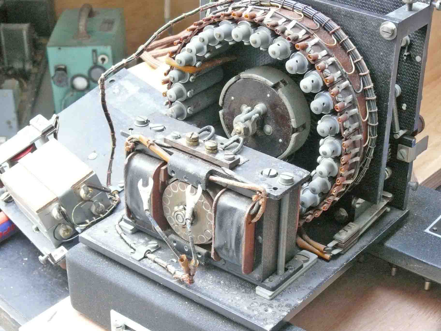Like in my Würzburg-Rep! survey, I was again trapped in the curious implications of a R and C circuitry. My experience with the Siemens G-Schreiber T52d where a capacitor was used to trigger a printing hammer such, that the paper was touching the rotating text-wheel just at the appropriate interval pointed me into the wrong direction. The arrangement of 27 x 1 µF high quality hermetically sealed-off capacitors of 1000 V type confused me seriously. Why 27 capacitors which were apparently all being fed via a separate 1.5 kohm resistor. What is more likely, than that the stored voltage is being used as to activate some mechanism?