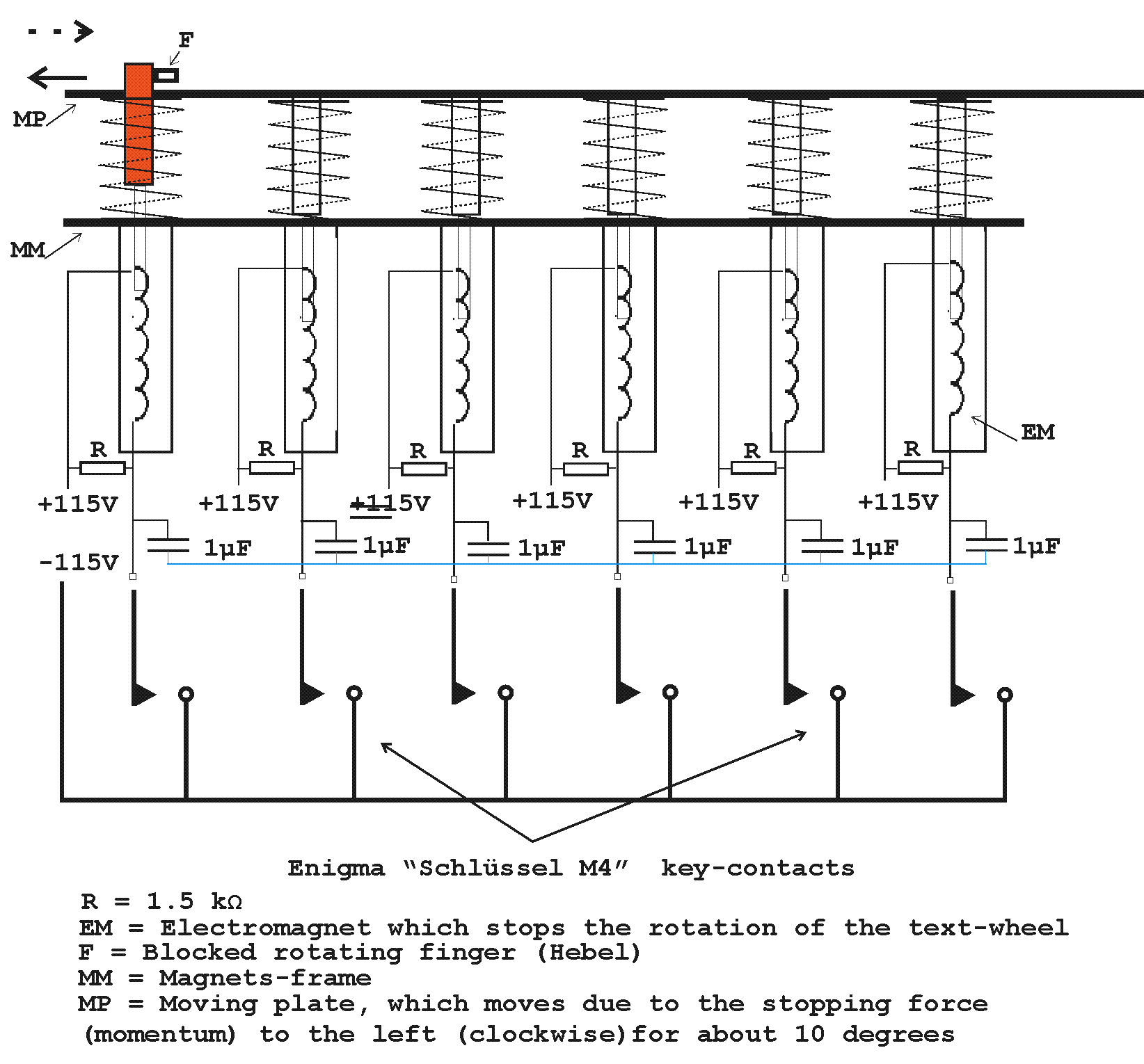 In my opinion quite curious is the fact that the lower sides of the 1 µF capacitors is interconnected between them only; it does not have a connection onto the rest of the circuitry. One may regard that it is "floating" (the cyan coloured wires). The system still does work when the "floating" section is being connected onto the negative pole of the power supply. But, this will cause damage to the Enigma switching contacts, as it will be discharged by means of the enigma keying contacts. Short circuiting a capacitor which is being charged up to 115 V at once, is causing a relative high current as its stored energy is: J = ½ CU² = 1.10-6 x 115² = 0.0066 Joule (neglecting the additional current through the magnet coil and the parallel resistor as well as the so-called reverse voltage originating from the interrupted magnetic flux of the magnet-coil). This may cause contact damage in the long run. During my experiments, when I had to trigger a contact manually, quite some sparks were seen. I guess, that the 1 µF capacitors are interacting as a damping network in combination with the inductances of the remaining 26 magnets as well as in combination with the 27 x 1.5 kΩ resistors parallel onto the electromagnets. The quality of these 1 µF capacitors maybe having an important function, as the used types are meant for 1000 V; and being of the so-called hermetically sealed-off types (guaranteeing a very long life cycle even good after minimally 65 years have been passed)! Nowadays one would use anti-parallel connected diodes instead. Although I cannot prove it, the HT voltage of 115 V dc might be a compromise as to limit unnecessary Enigma contacts loading. I have discussed this curious circuit with my friend Joop van Bree during a rather long telephone conversation (28 November 2010). In the prephase of my problem he directly interrupted me and said: I know this circuitry it is called "Snubber Schakeling". 'Snubber circuit' is thus the name. He also mentioned, that it is still an actual technique when very high power thyristors are involved. As diodes are not adequate enough damping the high anti-pulses owing to circuit inductance.
