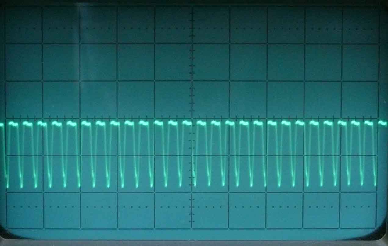 What we see on this photo differs a bit different from what the human eye is experiencing; when he looks at the CRT screen, due to the long exposure time of 1/6th of a second (using diaphragm 8). According the time base setting the pulse is repeating itself about every 20 ms.