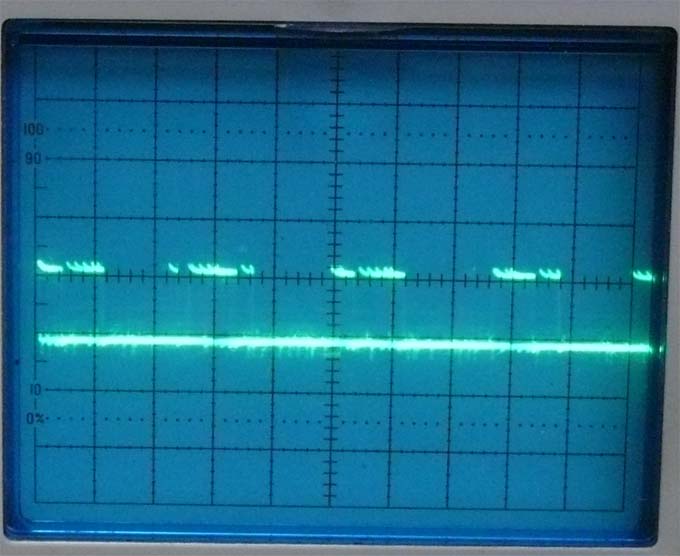 It is not easy photographing these kinds of screen shots, as the scope triggering has to cope with two different kind of signals the PRF of the timer-gating as well as the TB PRF. Also the quite long exposure time of my camera is a hampering factor.