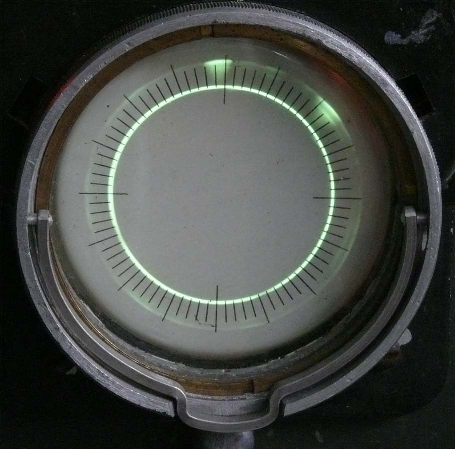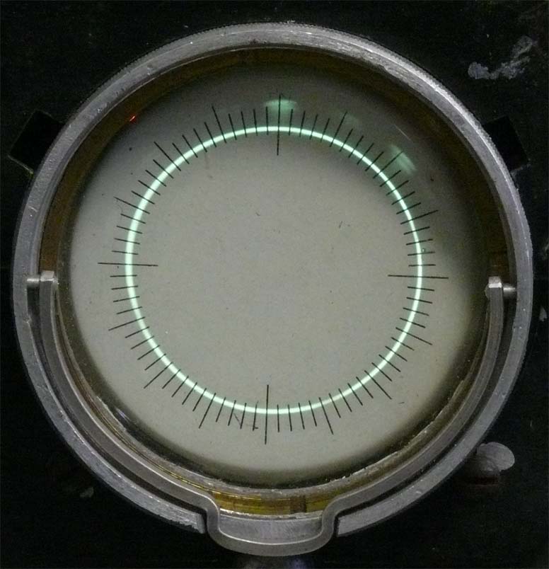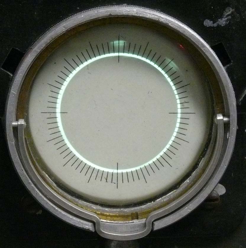 Finally, viewing the simulated aircraft display again. It seemingly shows the regular Nachtfee 'order' signal. The dotted circular trace originates from the EGON/IFF pulses (500 Hz), which differ, in our current case 6 Hz (compared to the Nachtfee operating channel Q8 = 506 Hz); proving that both signals do not interfere with the simulated Nachtfee 'order' signal pointing just due North