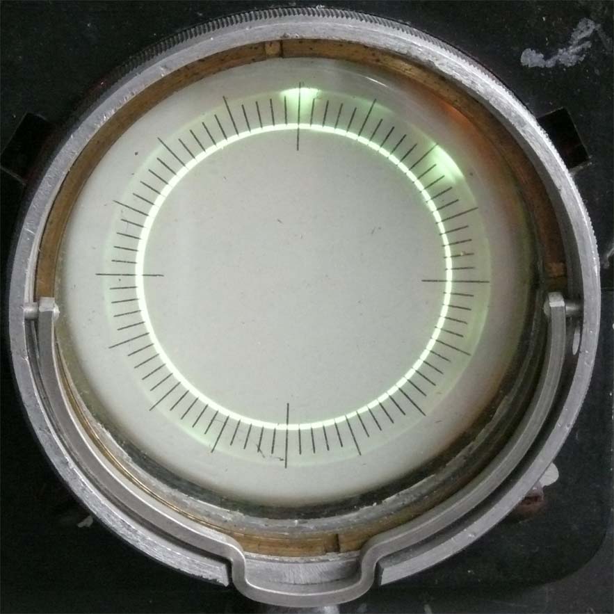 Film 74: Viewing the Nachtfee apparatus, we today encountered a small failure where the LB2 control screen did not provided the normal time base circle; the reason might be the fact that the deflection amplitude was too high or too low. Both causing the trace is outside the CRT screen, or just being hampered by the central conical anode cylinder. (00056)