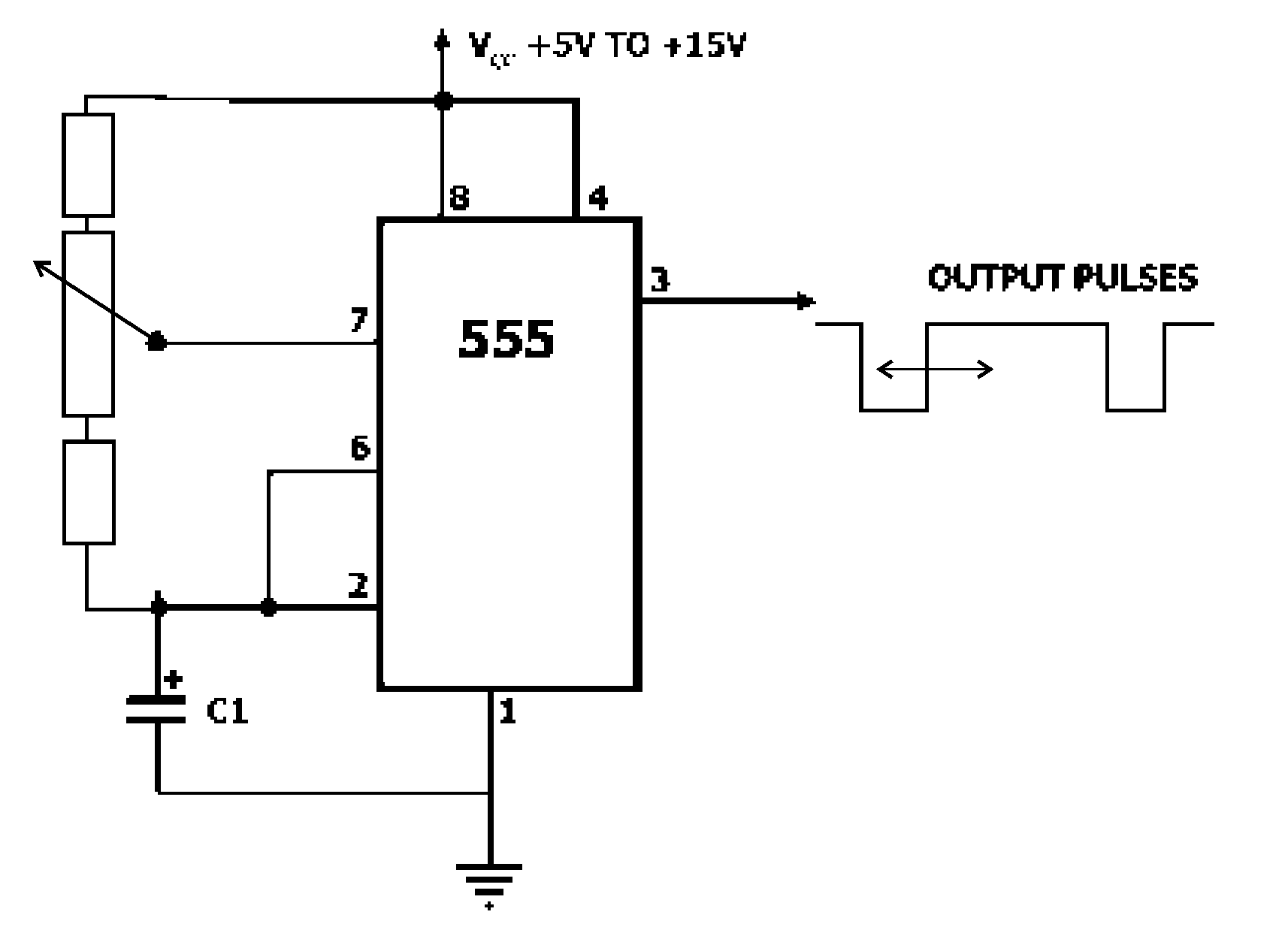 The on-off ratio can be experimentally adjusted by varying the potentiometer. The upper pulse line representing the off state as the NE555(556) is having an open collector output. Thus, when it is in off-mode the output level equals Vcc (12 V via a 7812 regulator as the NE555(556) Vcc may not exceed 15 V and we operate the rest of the pulse forming-amplifiers at about 25 V). The lower pulse-state (about ground level) is caused by the timer circuit.