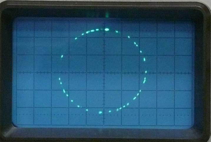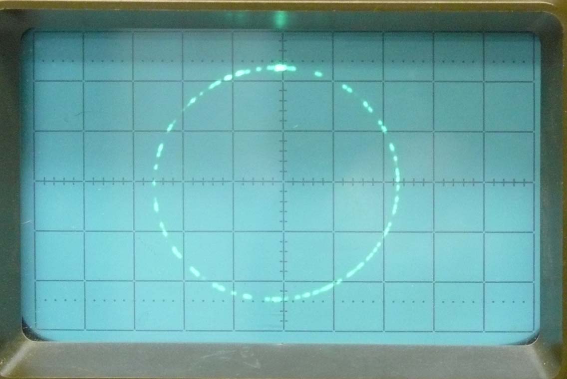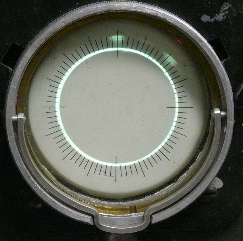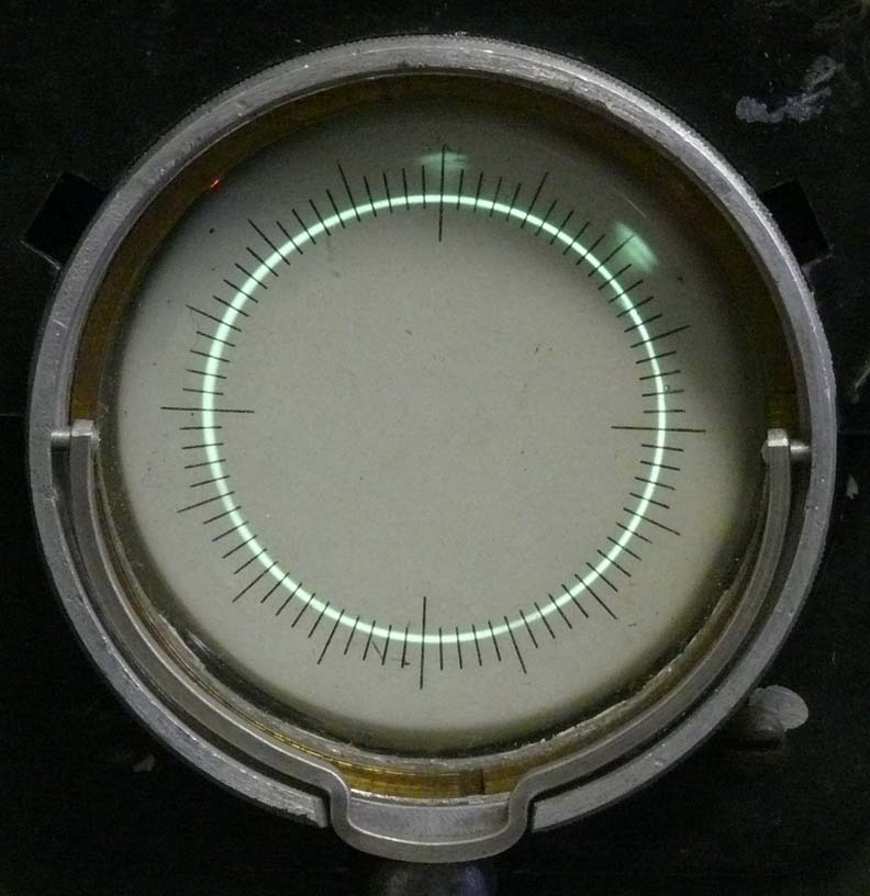 However, we can also convert it into a light-spot velocity per unit of time. The perimeter of a circle is determined by: πd. Let us estimate that the aircraft circular trace is according the scale division of our oscilloscope 5 cm, we get then 3.141 x 0.05 = 0.157 m. When we would have had 1 cycle per second, the spot velocity is 0.157 m/s. We have, however, to deal with 6 cycles per second, then we get a rotating spot velocity of 6 x 0.157 = 0.942 m/s. Noticing this value seemingly is too fast for our visual system. Whereas 2 Hz can be followed easily (0.314 m/s). Maybe the age of the observer plays a role though, I doubt that younger people will having no problems following the quite fast rotating light-spot trace at all. The simulated aircraft display suppresses the time-base spot rotation as long as there does not exist a receiver signal; owing to the adjustment of 'a kind of threshold' of the Z-modulation channel. Hence, what we see is just the rotation of the EGON pulses versus the Nachtfee time-base-reference. The consequence of all this, is the fact that when the circle diameter increases the spot velocity per unit of time does also.