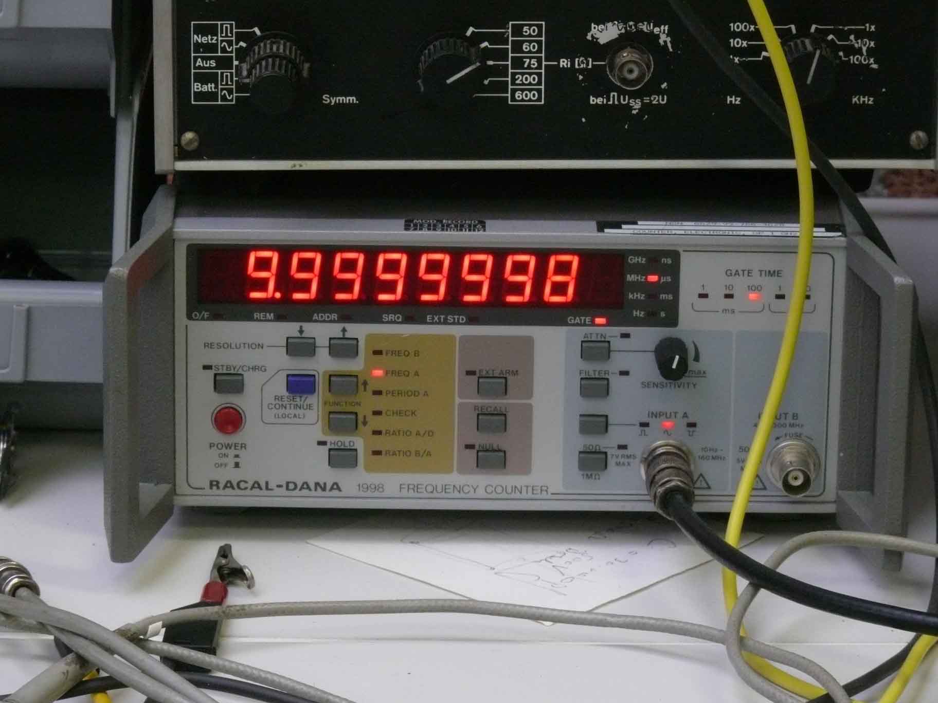 The reading is very stable, where the least significant digit is sometimes jumping to 8. I regard the HP quartz oscillator being more trustful than does the internal DANA counter reference. Interesting, is, how far its internal quartz reference runs from cold starting up to say after an hour of operation. It was already encountered that the DANA counter does not work fine when less stable signals have to be measured. Even the PM5193V synthesiser output signal is obstructing the way the DANA counter can cope with it. Whether this is owing to the way it has been designed I cannot judge, but also our second DANA counter shows the same kind of behaviour. Never the less, when clean and stable signal being provided it does very well its job.