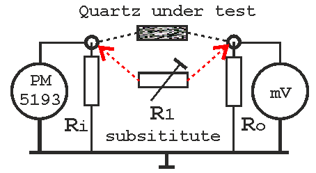 The setup for measuring the series quartz loss resistance R1, which is determining the Q-factor of a crystal.