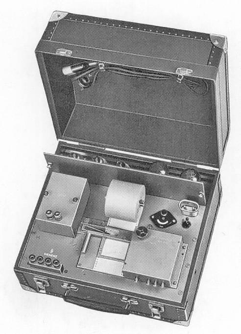 Its principle is based on electrical compensation of a signal level. The level compensation is accomplished by means of the appropriate movement of a potentiometer as to control the loop-gain. This mechanical movement is being exploited in such a manner, that the lever-pen is indicating the signal level of attenuation at an prepared paper tape (see the photo above).