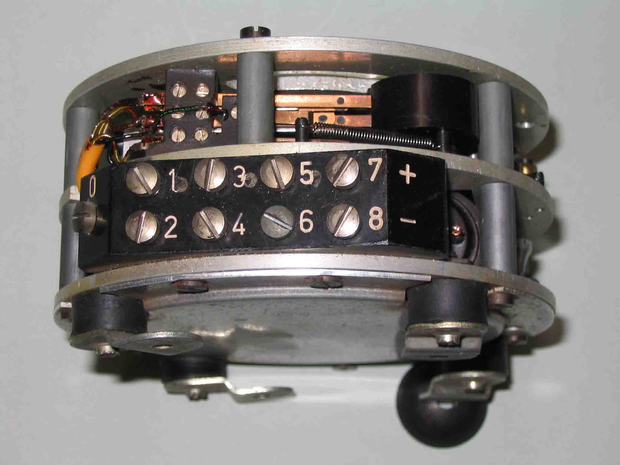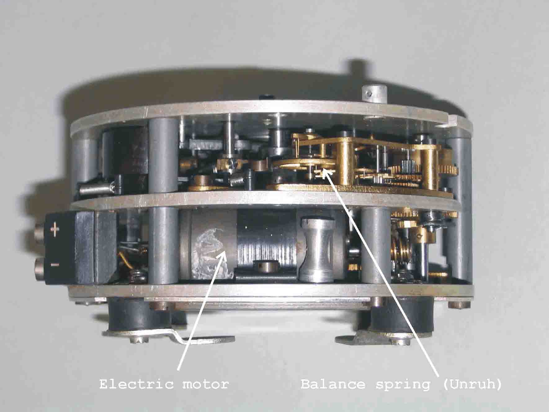 Remarkable is, its very neat and highly complicated construction. A miniature motor is driving (or winding-up?) the clock work. Also several switching contacts are available at the connection block of this device.